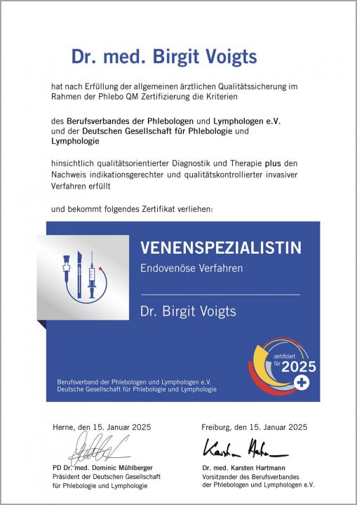 Die im individuellen Fall geeignete Methode ist abhängig vom klinischen Befund und einer Ultraschalldiagnostik des Venensystems. Ausgehend von den Untersuchungsbefunden wird Ihnen in unserer Praxisklinik im Rahmen einer ausführlichen Aufklärung die für Sie individuell optimale Therapie angeboten.