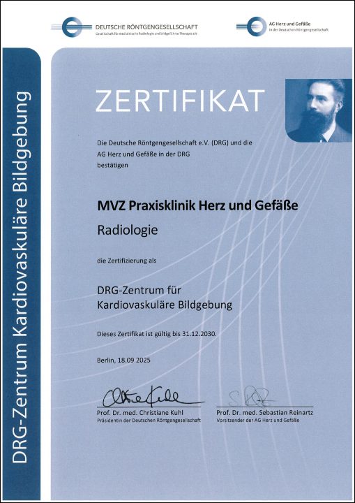 Das MVZ Praxisklinik Herz und Gefäße wurde als DRG-Zentrum für Kardiovaskuläre Bildgebung zertifiziert. Ziel der Benennung zum DRG-Zentrum ist es, Patienten eine optimale medizinische Versorgung im Rahmen der kardiovaskulären Diagnostik auf höchstem Niveau zu bieten.